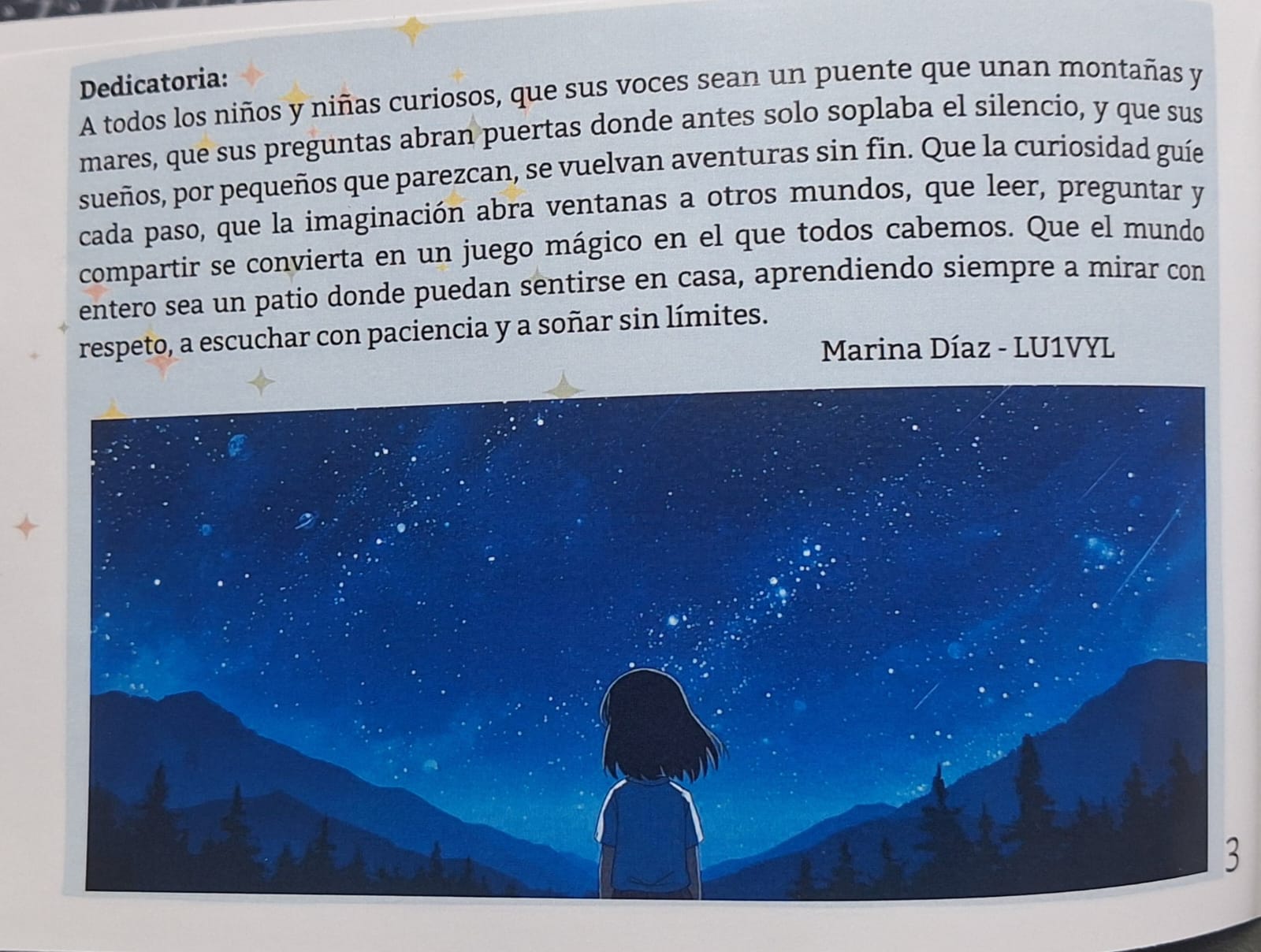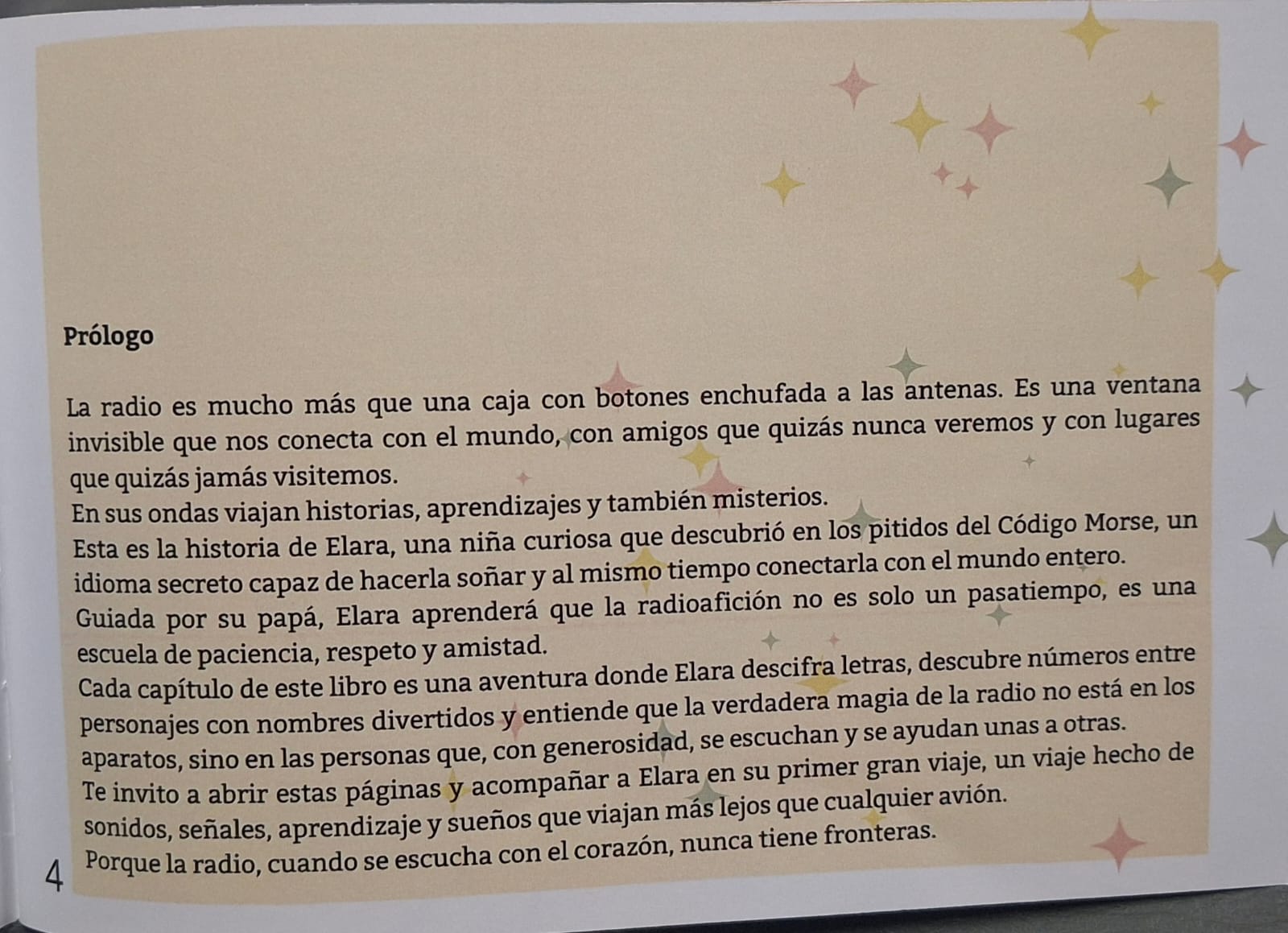 En su dedicatoria, la autora invita a los niños a dejarse llevar por la curiosidad, a explorar, preguntar y soñar sin límites, mientras el prólogo revela el corazón del relato: la radio como una ventana invisible que une personas y culturas, donde cada sonido puede convertirse en un mensaje lleno de significado.